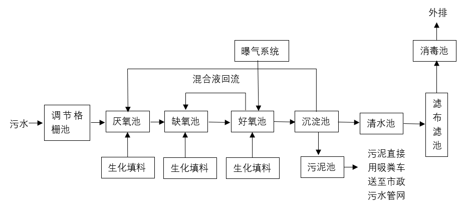 生活污水经过收集管道进入污水处理站,进入污水处理站的污水先通过格栅除去污水中颗粒较大的悬浮物后进入沉淀调节池去除部分SS、COD、BOD等物质,经预处理的污水进入生化处理池。在生化段,采用厌氧-缺氧-好氧三段式生物处理,进行水解酸化、硝化及反硝化、吸附氧化等生物反应,消化降解污水中COD、氨氮、TP、SS等污染物。技术配置化学除磷,提高总磷去除率。工艺结合滤布滤池,降低SS和总磷,*后达标排放。工艺产生有机质底泥较少,对产生的沉淀池底泥,采用污泥泵抽至污泥干化池自然干化及石灰*后可作站内绿化用肥或运至垃圾填埋场填埋。