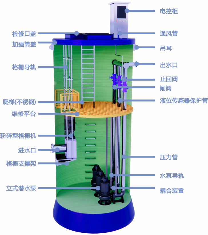 设计先进:采用国际的流场计算,使得尽可能把淤泥等固体颗粒排除设备。工控设计:采用施耐德电气品牌,触摸屏设计,含通讯RS485接口。泵站应具备手动控制、自动控制和远程检测功能,不同控制方式之间应可以自由切换。新型材质: 一体化预制泵站筒体结构由纤维缠绕玻璃钢(GRP)制成,采用意大利VEM公司设备,全自动化控制连续缠绕成型,确保厚度均匀并达到设计的刚度,质量稳定优良。配件标准: 所有配件都在工厂内设计、制造完成,包括压力管路、检修平台、进出水管等,出厂前进行严格的调试保证泵站的可靠性。高度集成: 泵站作为一体化设备,成套提供:泵站筒体、压力管道、检修平台、检修爬梯、格栅过滤装置、耦合系统、泵提升系统、通风装置、防滑井盖、照明系统等。外形美观: 一体化预制泵站全部埋于地下,地面只留有检修孔和控制箱,也可选配景观式管理房置于地上,与周围环境相协调。