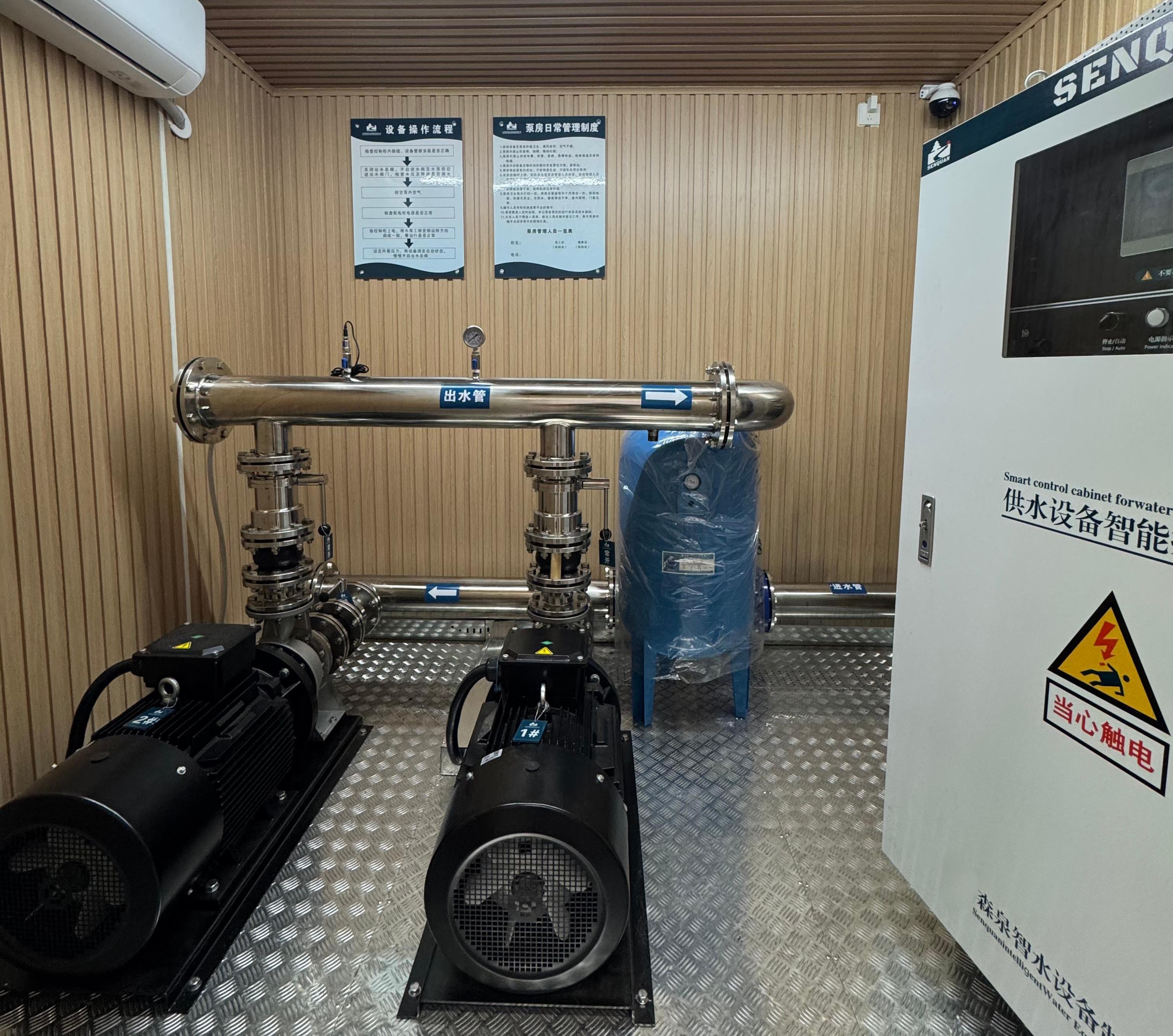 提供一个电源和对接进出口管路即可快速供水。泵房内外安装有视频监控设备、门禁识别系统、水淹检测以及烟雾报警设备等,*保障泵房的*运行。泵房墙体内部放置隔音棉,地板做减震降噪处理,防止噪音 智能云平台会定时对设备的健康状况进行分析评估,提醒用户设备潜在危险,保障设备*稳定运行, 泵房内安装有空调和*机,系统时刻检测房间内的温度,当温度过高或过低时自动启动空调制冷或制热;湿度过大时自动启动*机进行*,确保泵房正常运行。