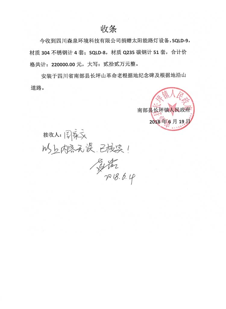 森泉环境集团捐赠太阳能路灯给长坪山革命老区